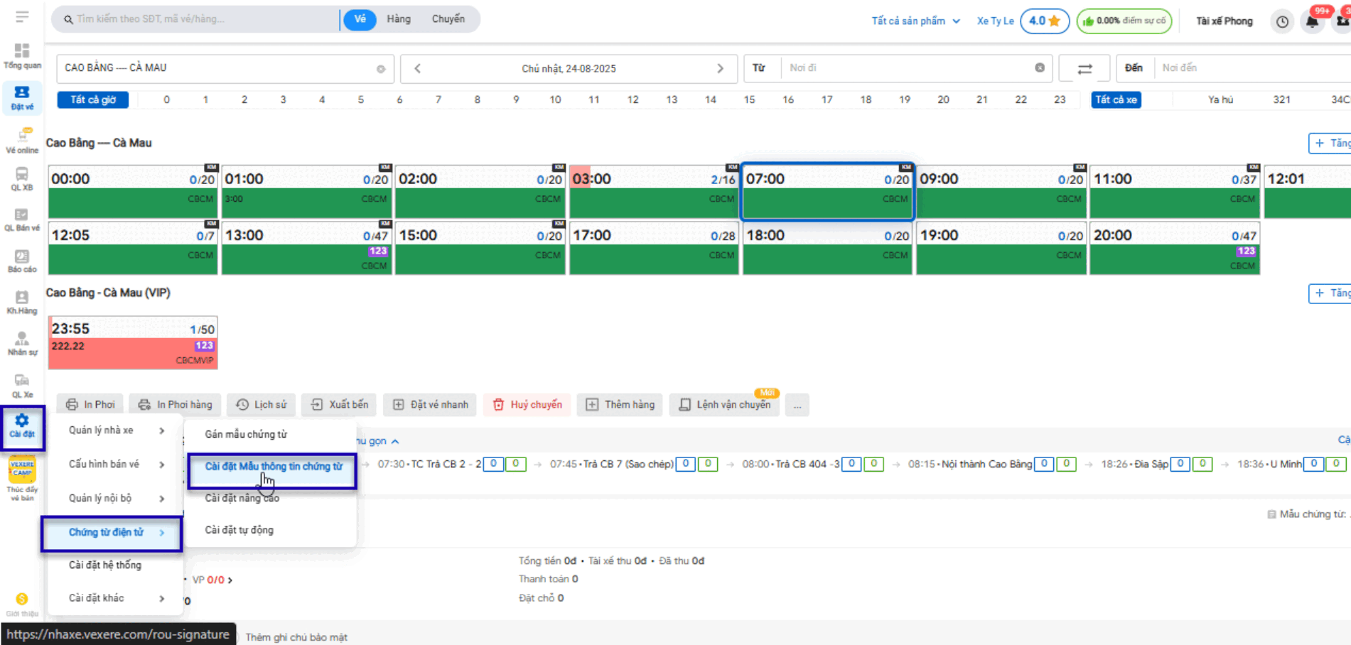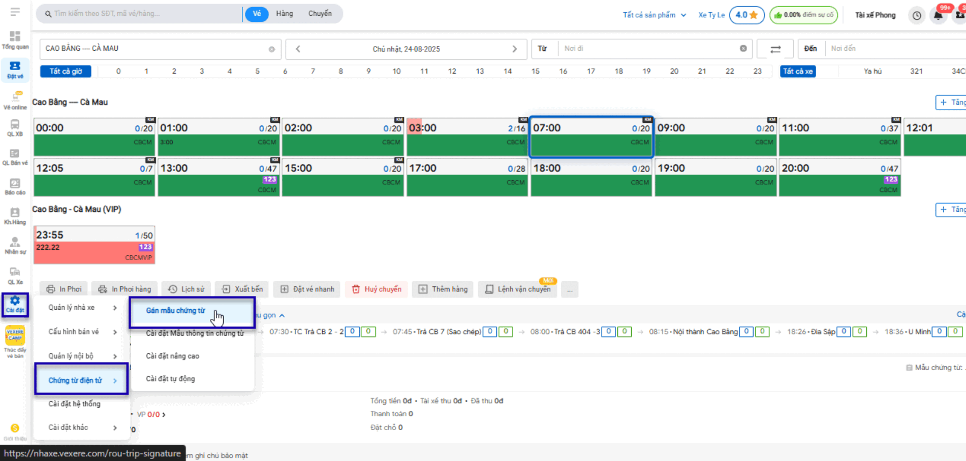 - Bước 2: Kiểm tra lại đã gán mẫu vé/hóa đơn điện tử của nhà xe vào tuyến đường muốn xuất vé điện tử chưa. Nếu chưa đúng vui lòng thao tác lại.