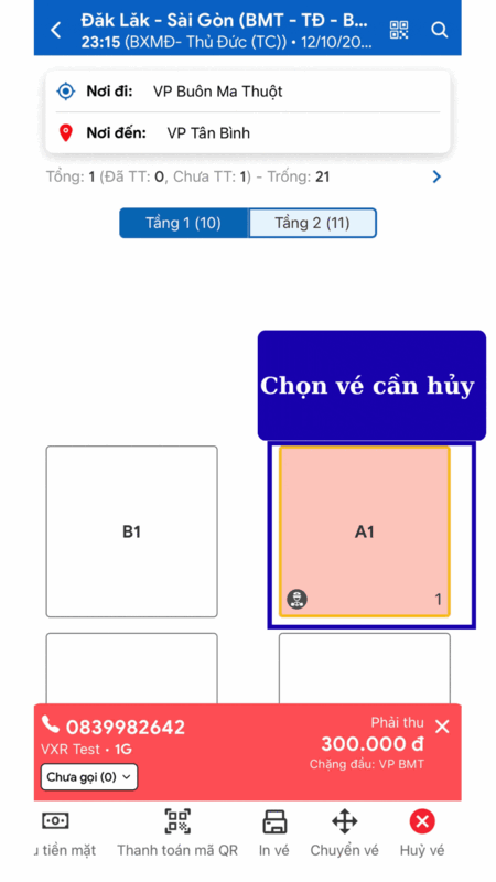 Trong quá trình vận hành, đôi khi hành khách cần thay đổi kế hoạch, chuyển chuyến hoặc yêu cầu hủy vé. Ứng dụng Tài xế cho phép bác tài thao tác hủy vé nhanh chóng, giúp cập nhật lại sơ đồ ghế và danh sách hành khách kịp thời, tránh sai lệch khi xe xuất bến.