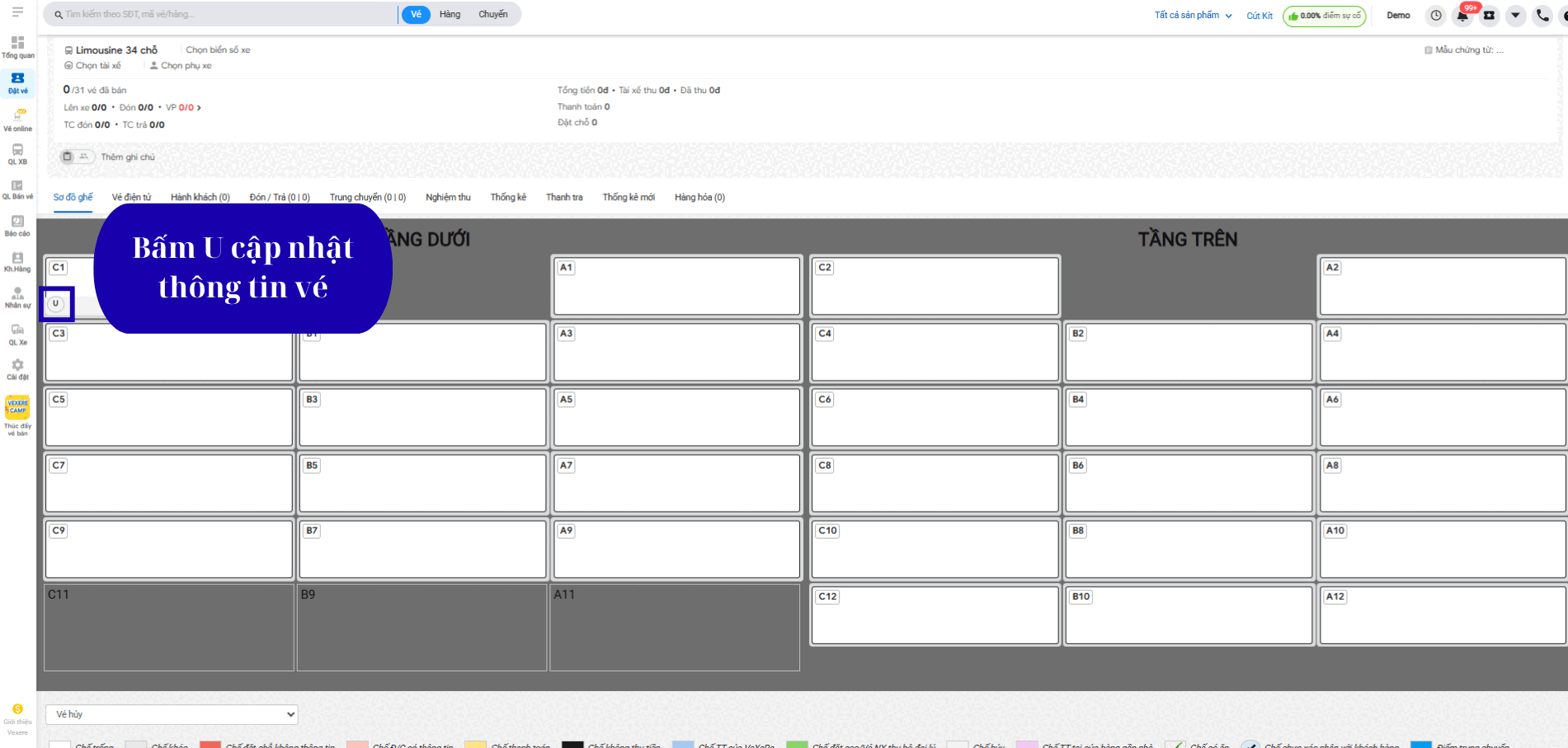 Bước 1: Ở màn hình “Đặt vé” bấm U và cập nhật thông tin vé