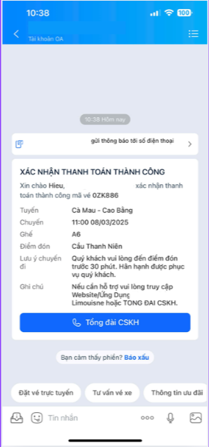 Sau khi thanh toán xong, sẽ có thông báo zalo như hình và vé sẽ tự được cập nhật trạng thái “Đã thanh toán”