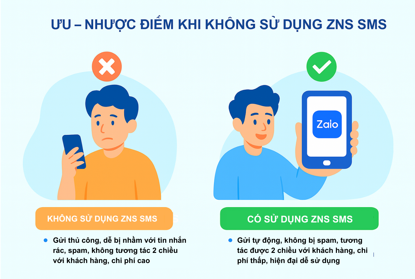 | 💰 Chi phí | SMS truyền thống tốn phí cao, không tối ưu | ZNS SMS chi phí thấp hơn, không giới hạn ký tự, không bị trừ tiền theo đầu số |