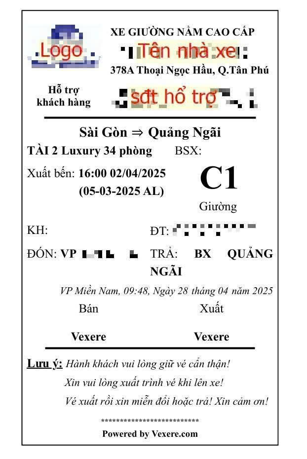 - 💻 Mẫu vé điện tử trên phần mềm hóa đơn/vé điện tử của nhà cung cấp: Đây là mẫu vé đã được khai báo với cơ quan thuế, sử dụng cho mục đích xuất hóa đơn điện tử. Nếu nhà xe có nhu cầu điều chỉnh mẫu vé điện tử, vui lòng liên hệ trực tiếp với đơn vị cung cấp phần mềm để được hỗ trợ theo đúng quy định.