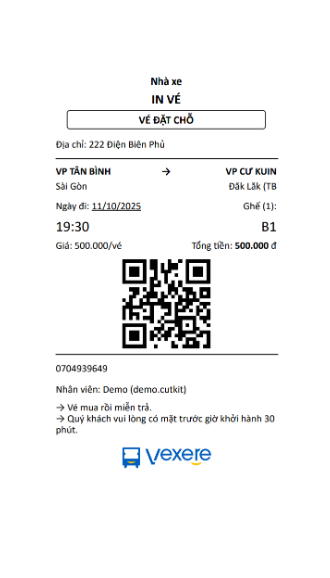 - 🎨 Tự thiết kế theo ý muốn: Nhà xe có thể tự thiết kế mẫu vé theo phong cách riêng — từ logo, màu sắc, bố cục, nội dung hiển thị đến kích thước. Điều này giúp đồng bộ với thương hiệu và nâng cao tính chuyên nghiệp.