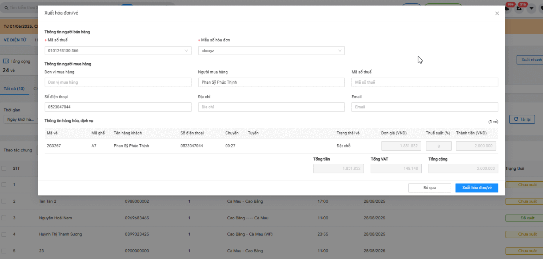 - Nhân viên bán vé hoặc kế toán hỗ trợ xuất vé/hóa đơn điện tử
