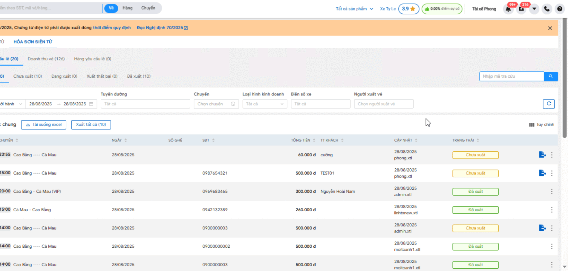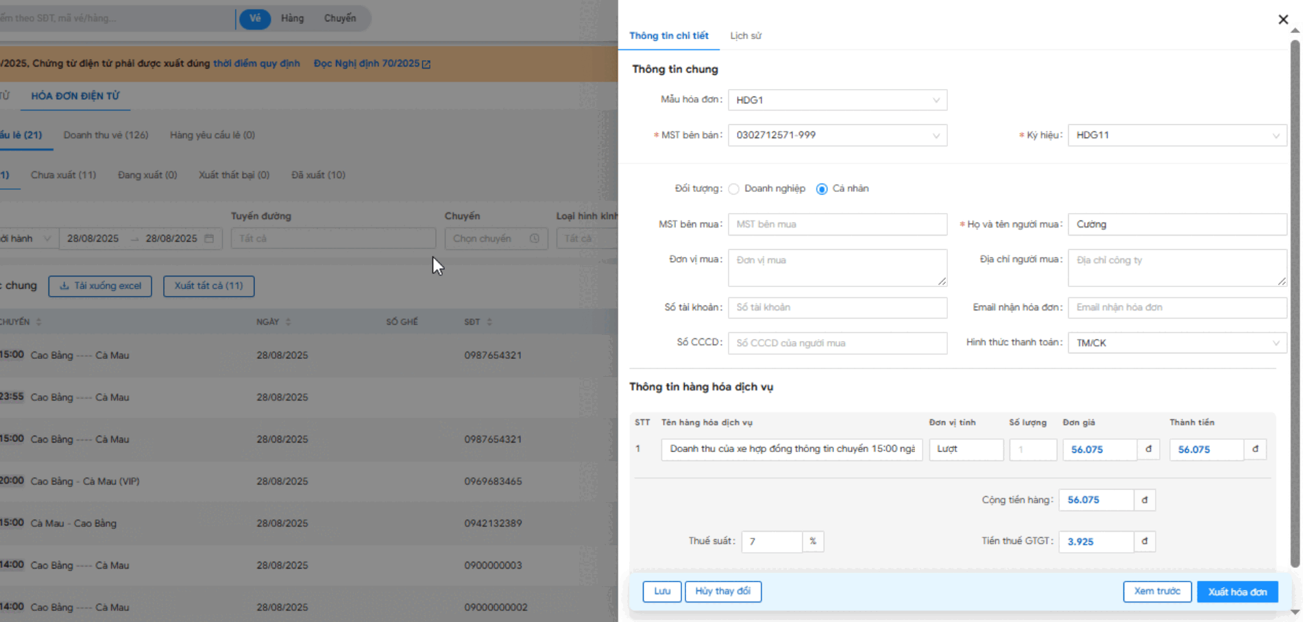 - Kể từ ngày 1/7/2025, các vé/hóa đơn điện tử đã xuất sẽ không xóa đi xuất lại hoặc cập nhật, điều chỉnh được. Trong trường hợp có sai sót vui lòng yêu cầu điều chỉnh với cơ quan thuế