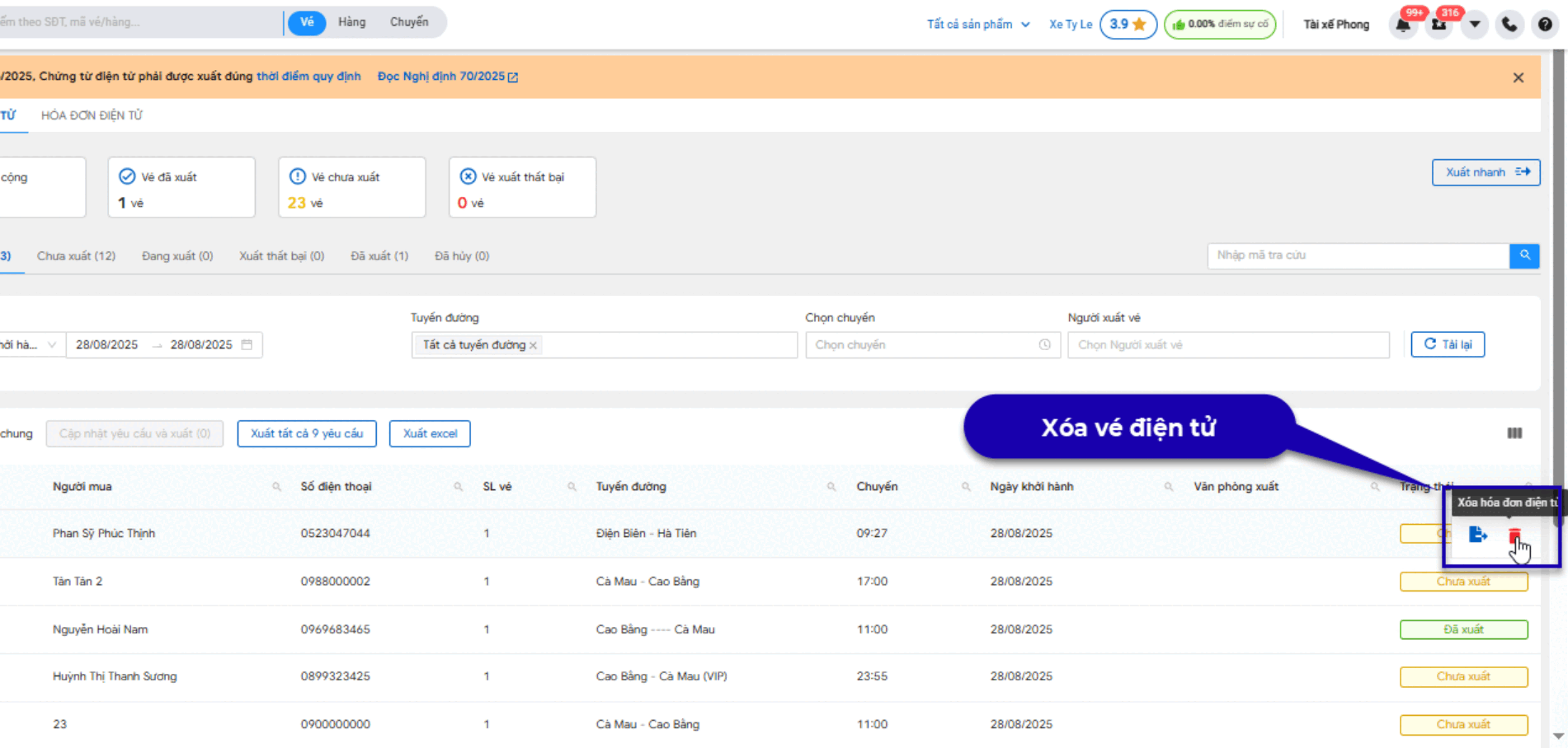 - Chức năng Xóa vé/hóa đơn trên chỉ dùng trong mục đích ẩn trên phần mềm quản lý bán vé. Ngoài ra khi xóa sẽ không xóa ở phần mềm kế toán hoặc ở cơ quan thuế.