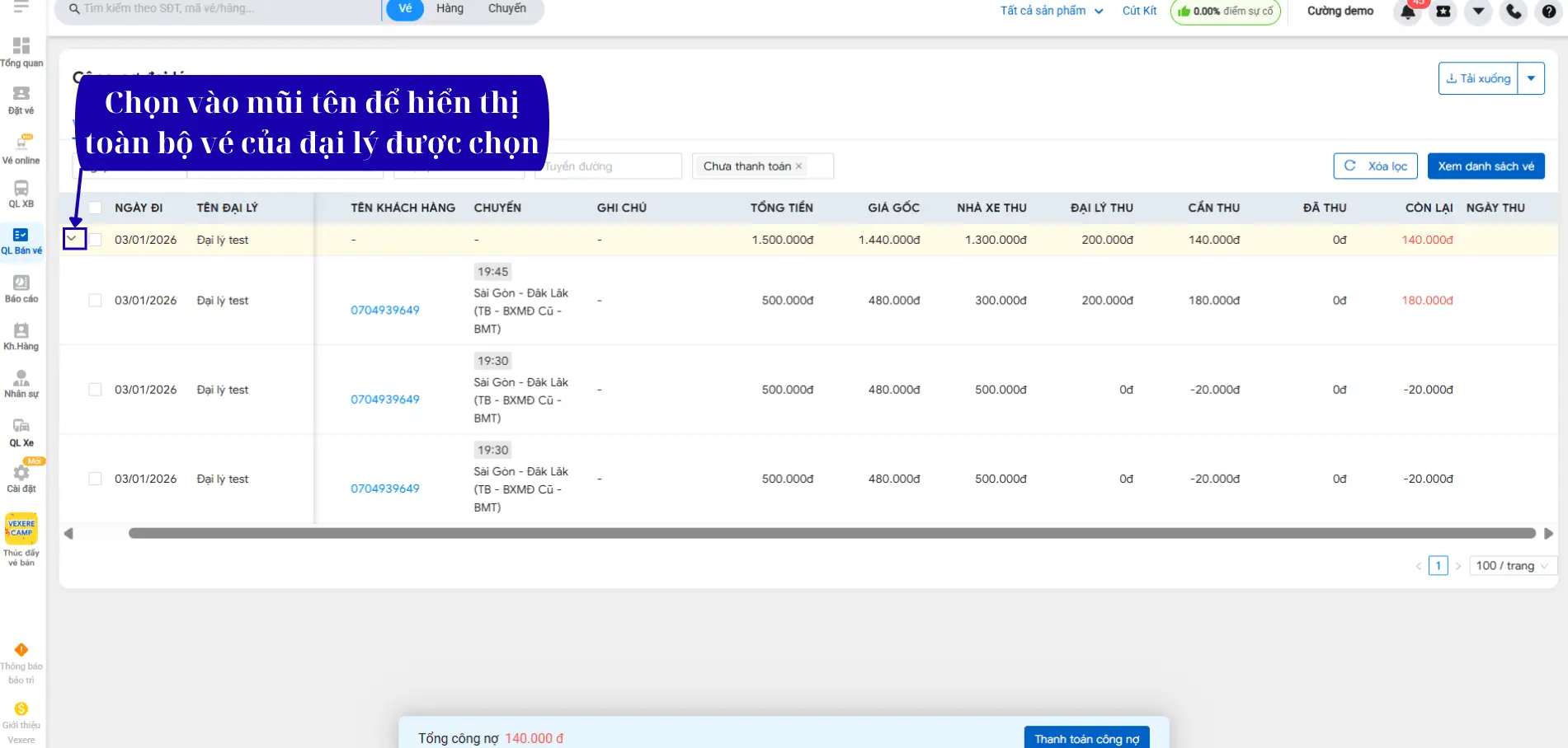 Bước 3: Màn hình hiển thị danh sách đại lý -> Chọn mũi tên để hiển thị chi tiết toàn bộ vé của đại lý