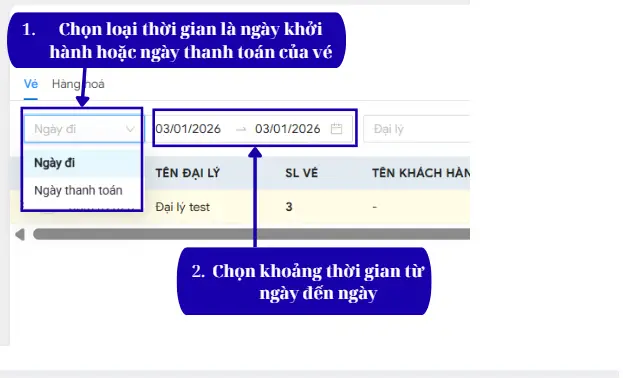 Người dùng có thể chọn lọc theo ngày khởi hành hoặc ngày thanh toán của vé. Việc lựa chọn đúng loại thời gian giúp hệ thống hiển thị chính xác các vé cần đối soát theo mục đích kiểm tra. - 2. Khoảng thời gian lọc
