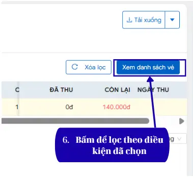 Người dùng có thể lọc theo trạng thái vé như: đã thanh toán, chưa thanh toán, đặt chỗ… để dễ dàng kiểm tra tình trạng thu tiền và công nợ tương ứng. - 6. Thực hiện lọc