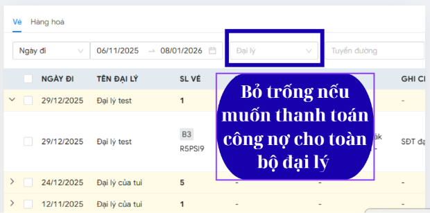 Người dùng có thể chọn một đại lý cụ thể để đối soát công nợ riêng với đại lý đó. Nếu không chọn, hệ thống sẽ hiển thị toàn bộ vé của tất cả đại lý, phù hợp khi cần tổng hợp công nợ chung. - 4. Lọc theo tuyến đường