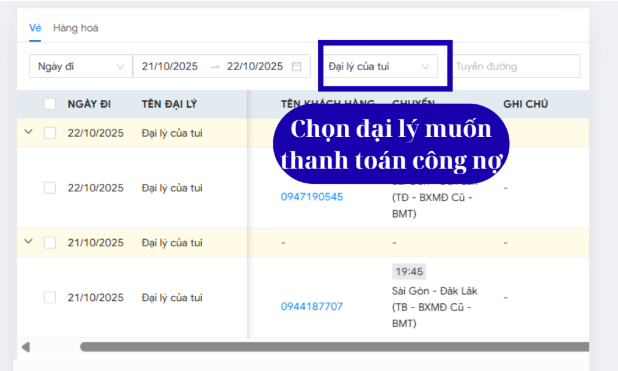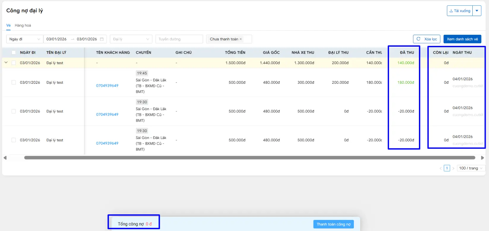 - Nếu số tiền còn lại hiển thị số âm -> Nhà xe nợ đại lý và cần phải thanh toán công nợ lại cho đại lý