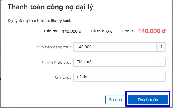 Lưu ý: “Tổng công nợ” là tổng số tiền công nợ của toàn bộ đại lý đang được hiển thị trong danh sánh -> sử dụng đúng bộ lọc đại lý để thanh toán công nợ trong các trường hợp như sau: