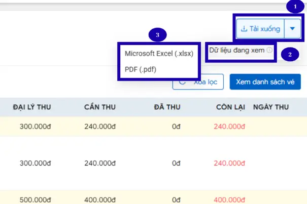 Thao tác: Bấm nút “Tải xuống” ở phía bên phải màn hình -> Chọn “Dữ liệu đang xem” -> Chọn loại file xuất (Excel hoặc PDF) -> Hoàn thành xuất, tải file