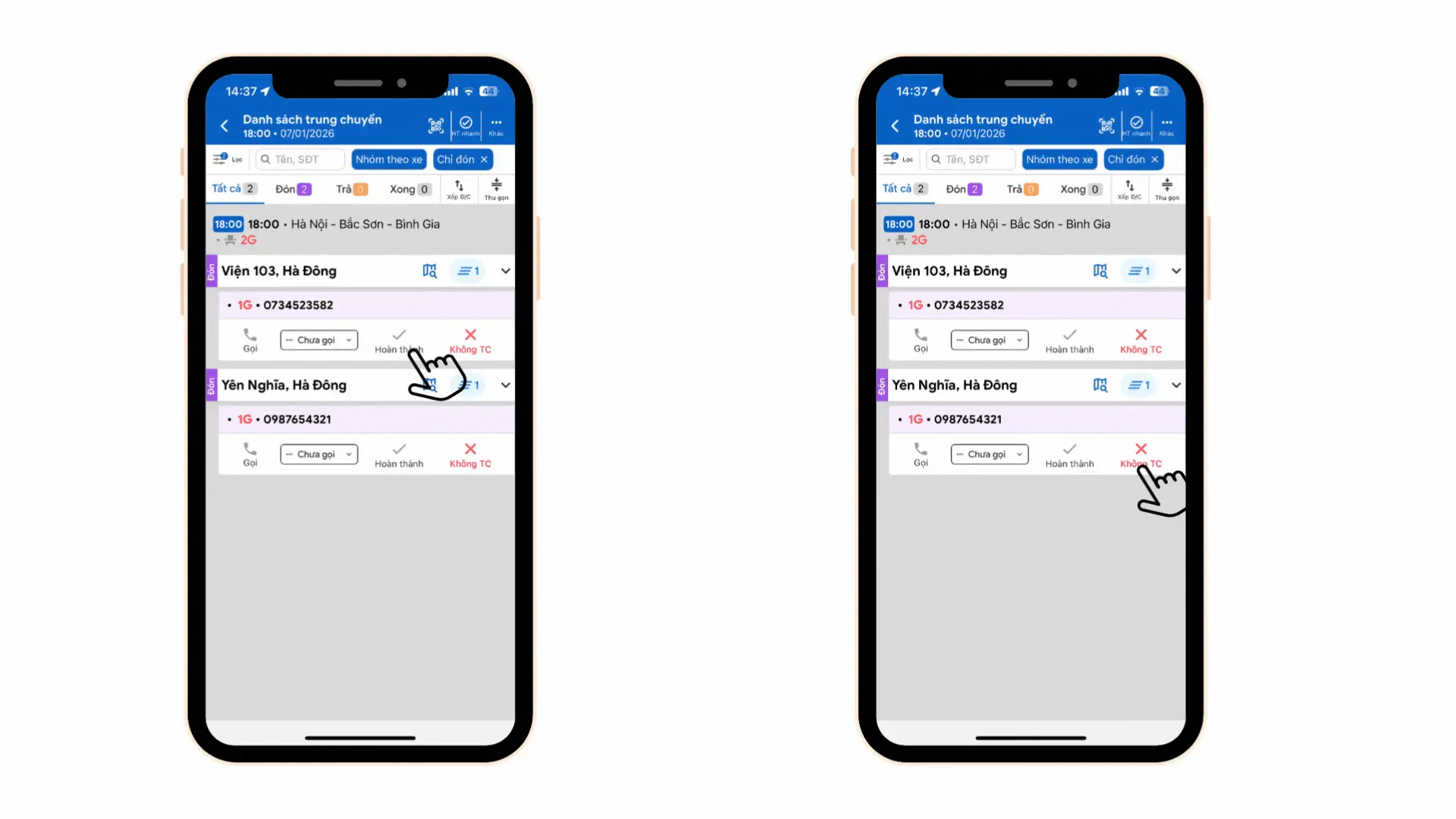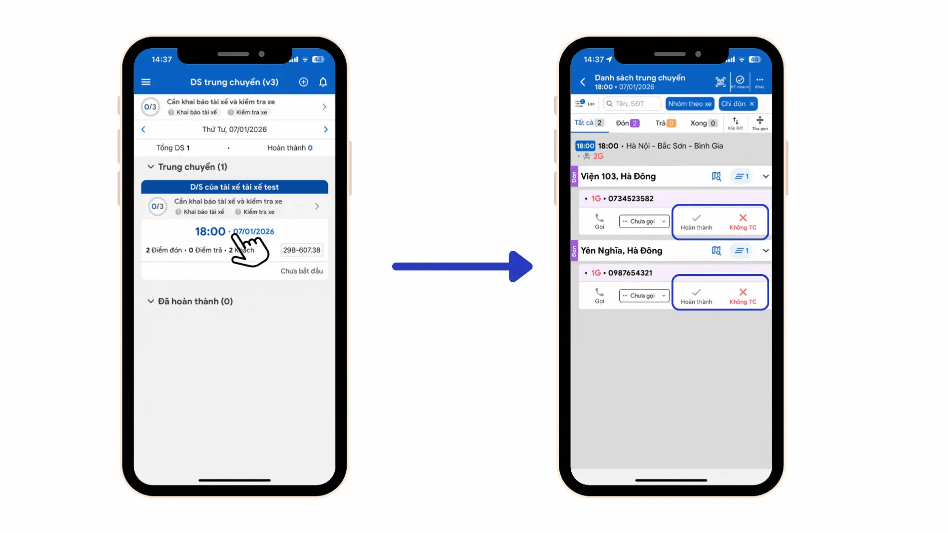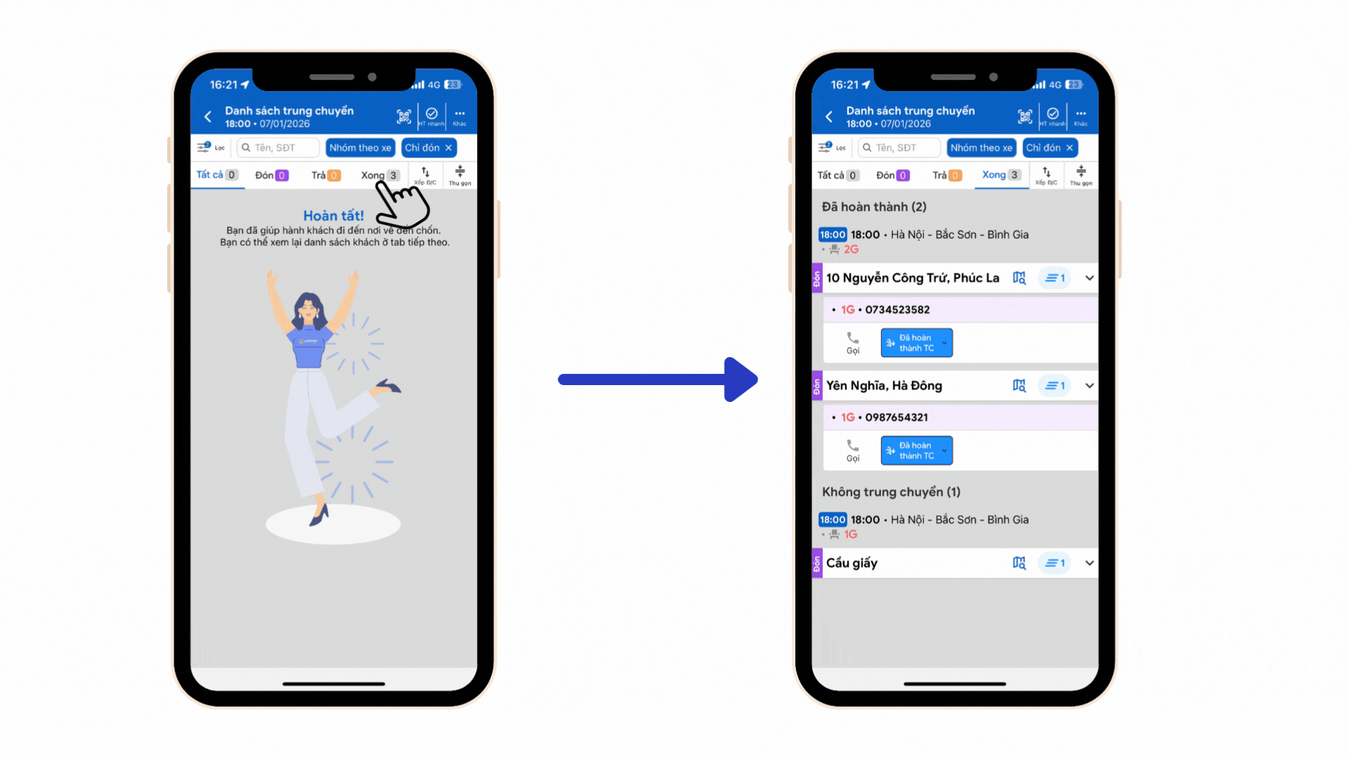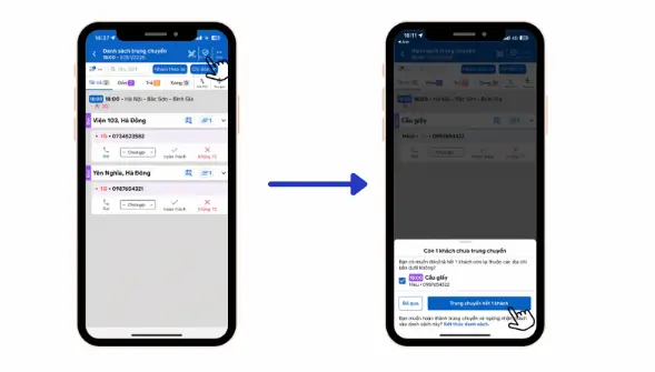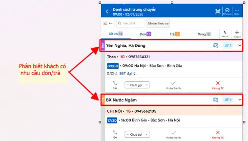 ⇒ Chọn Hoàn thành khi khách đã được đón hoặc trả đúng theo chuyến trung chuyển.