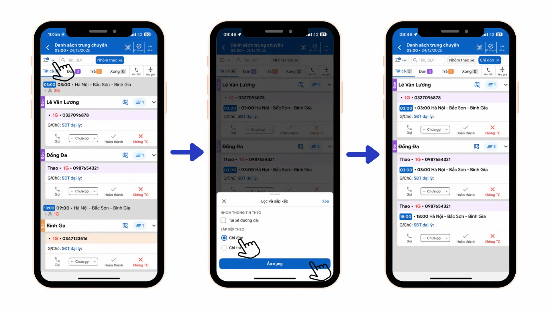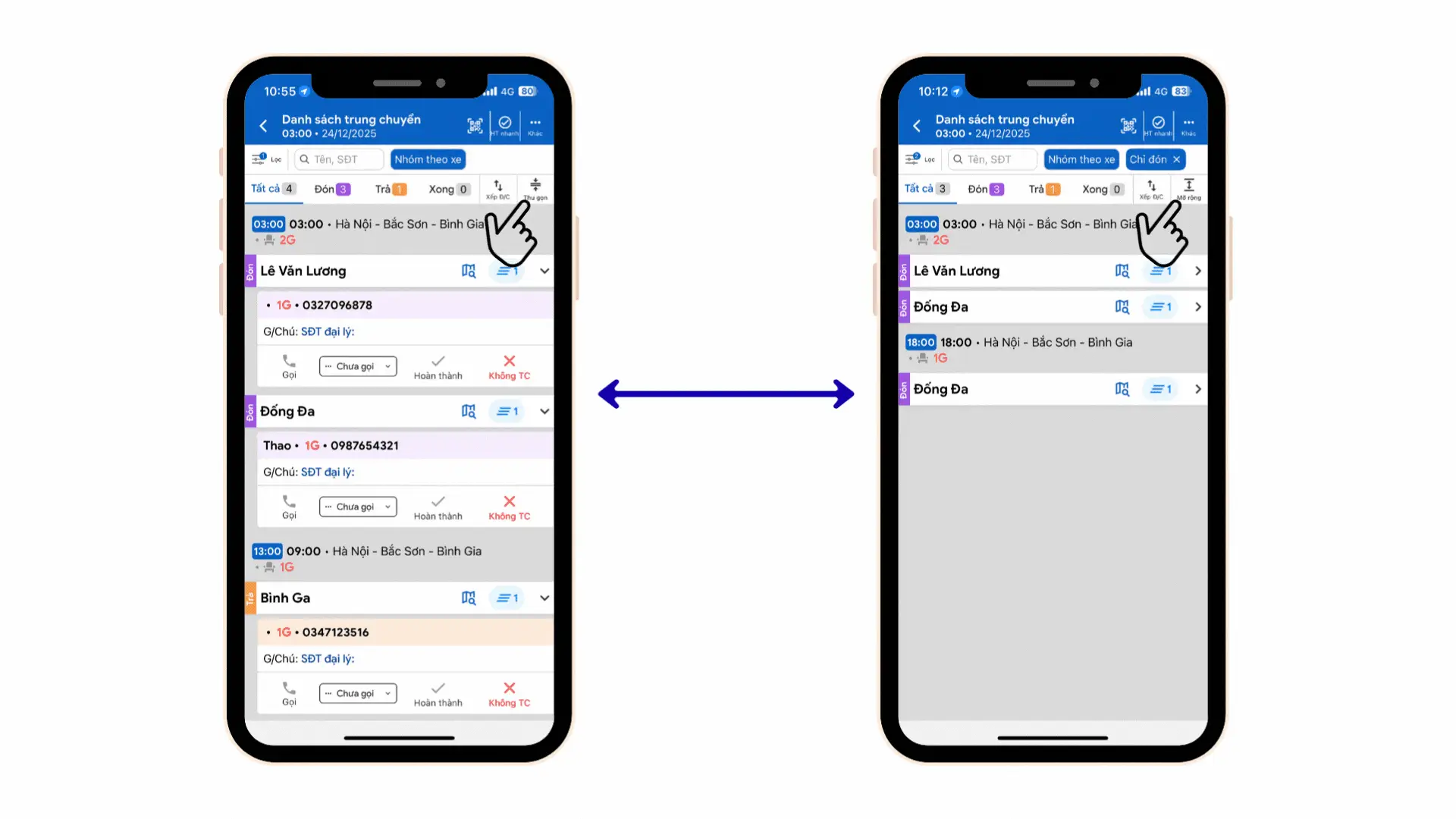 Tình huống 1: Phân loại theo mục đích hiển thị đón/trả. Tại màn hình danh sách chi tiết hành khách trung chuyển tài xế chọn phần bộ lọc ở góc trên bên phải màn hình sau đó bấm chọn sắp xếp theo “Chỉ đón” hoặc “Chỉ trả”. Sau đó màn hình ứng dụng danh sách hành khách sẽ hiển thị theo mục đích hiển thị tương ứng.