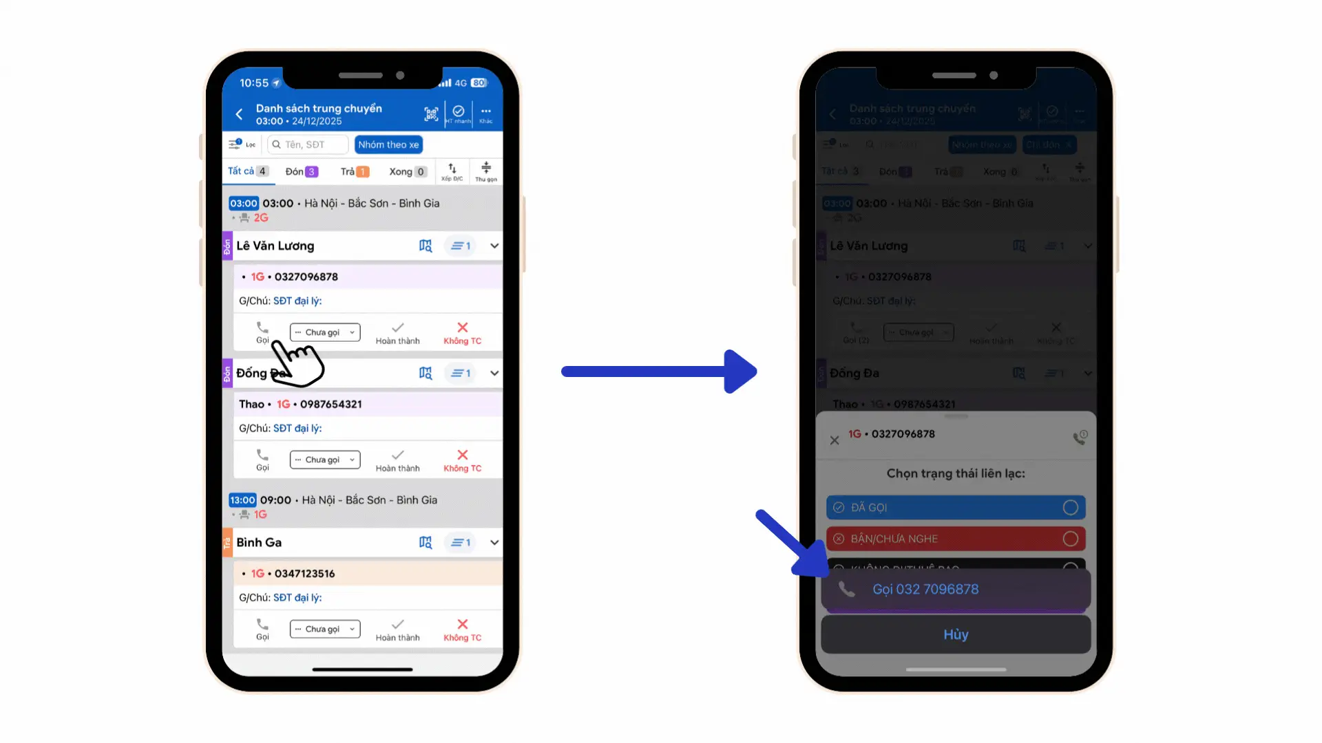 ⇒ Khi khách xác nhận không đi, hoặc số điện thoại không liên lạc được/thuê bao không tồn tại.