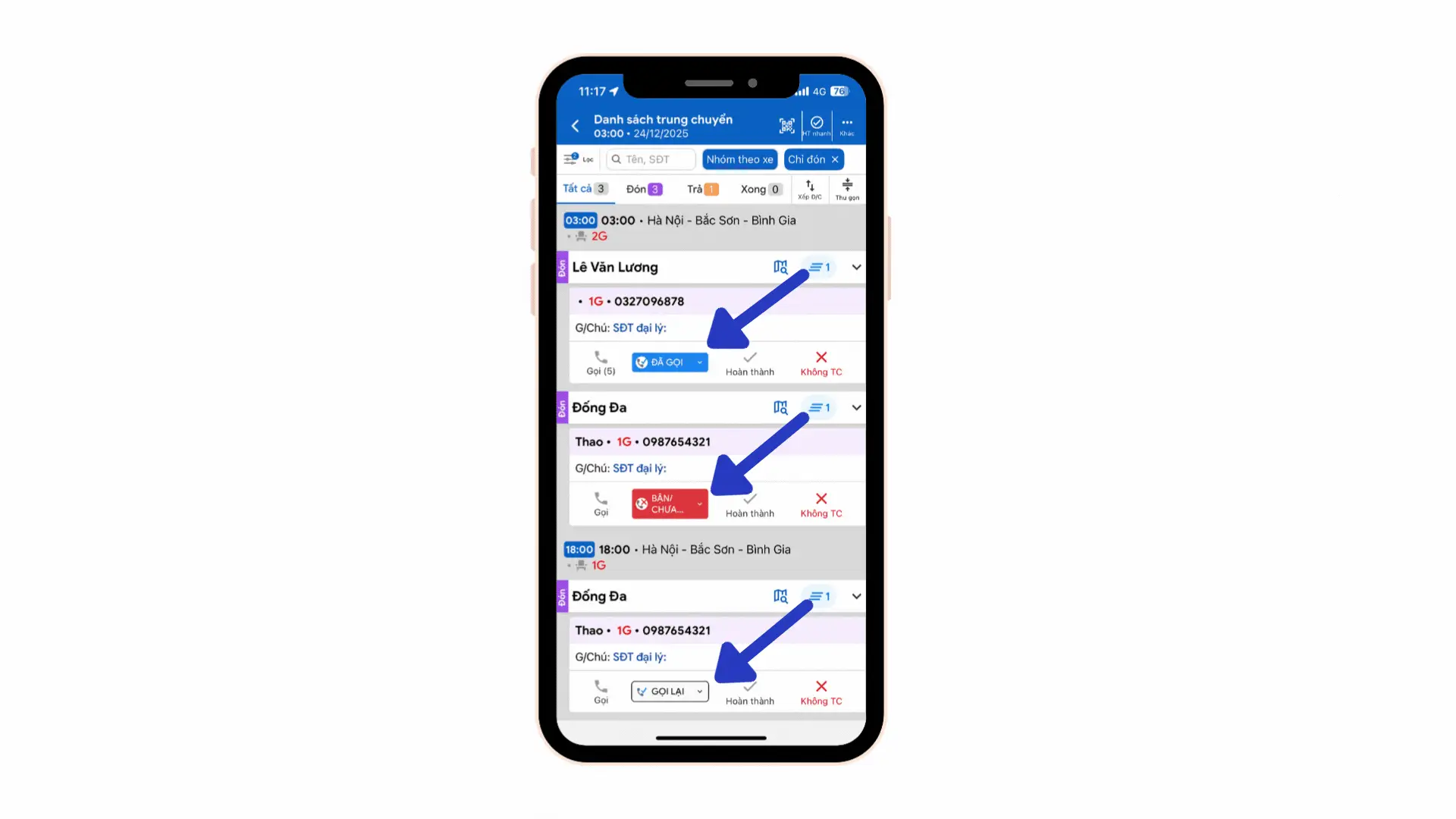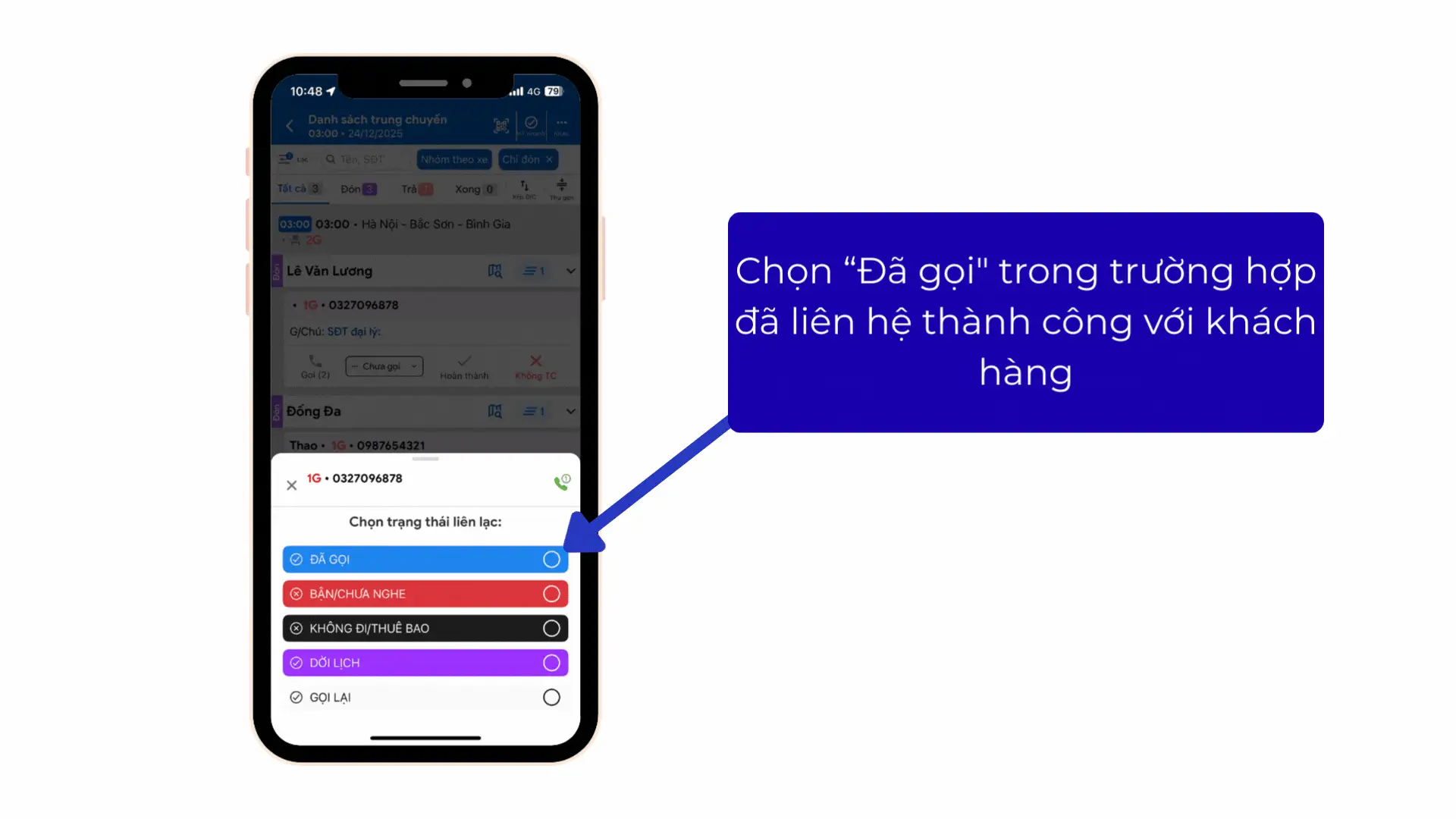 Bước 3: Tài xế cập nhật trạng thái cuộc gọi sau khi thực hiện cuộc gọi với khách hàng theo các trạng thái tương ứng. Các trạng thái hiện tại bao gồm: Đã gọi, Bận/Chưa nghe, Không đi/Thuê bao, Dời lịch, Gọi lại
