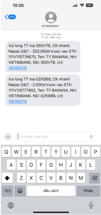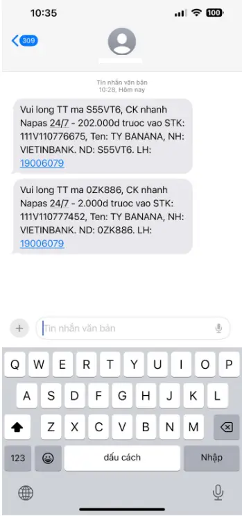 - Qua tin nhắn (SMS/ZNS): Hệ thống gửi tin nhắn chứa thông tin tài khoản, khách hàng tự chuyển khoản.