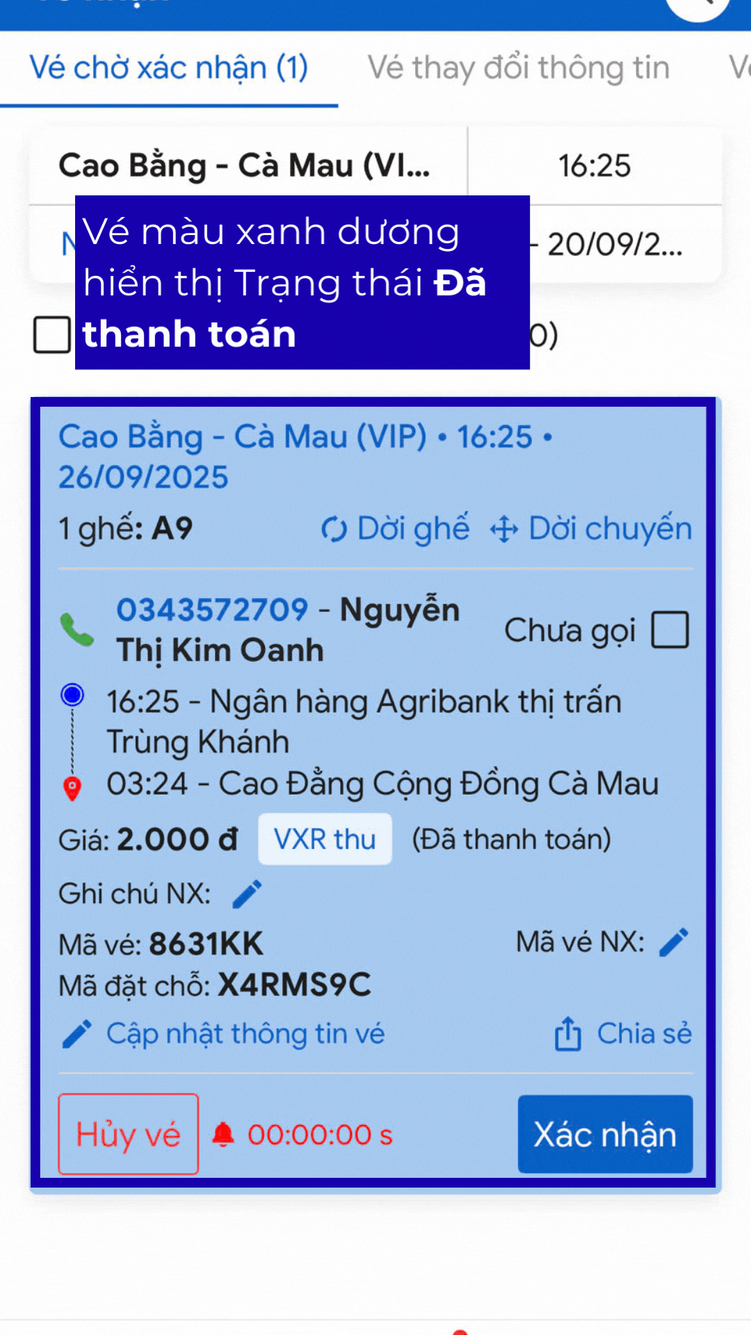⇒ Có. Xác nhận vé đổi trạng thái từ Đã đặt sang Đã xác nhận. Điều này đảm bảo khách lên xe đúng chuyến đúng ghế và thông tin đồng bộ với Vexere.