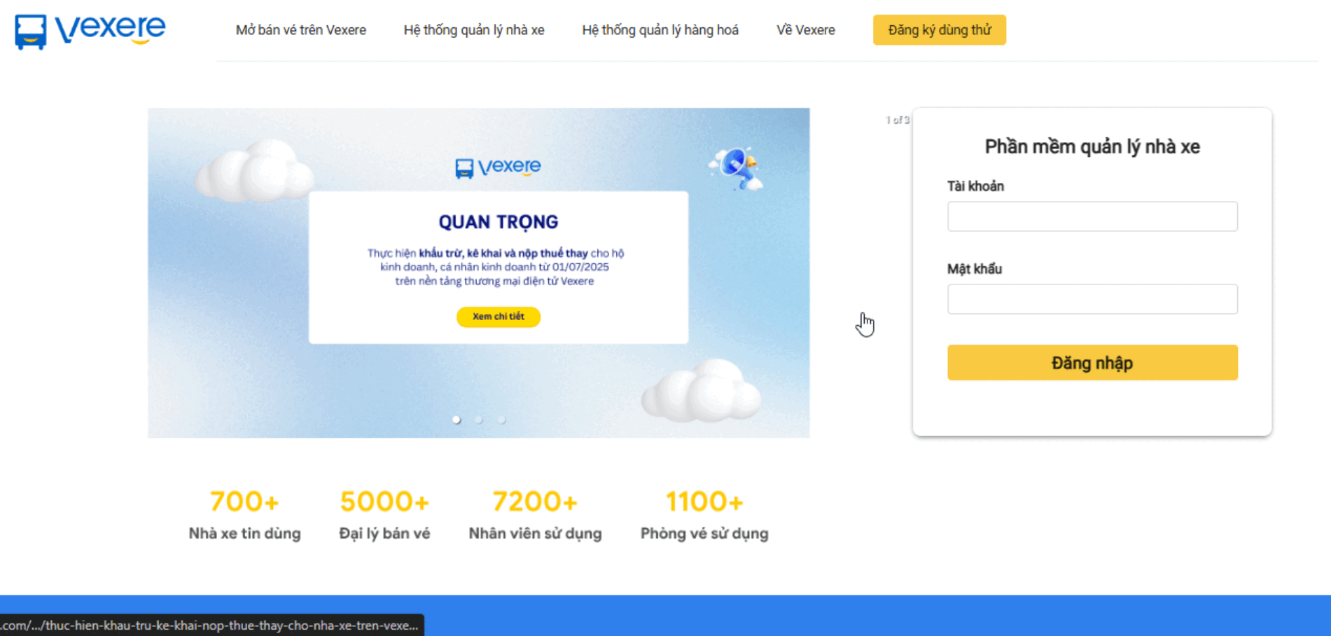 Bước 1: Vào đường link Phần mềm Quản lý bán vé (https://nhaxe.vexere.com/), đăng nhập bằng tài khoản của nhà xe đã được cung cấp.
