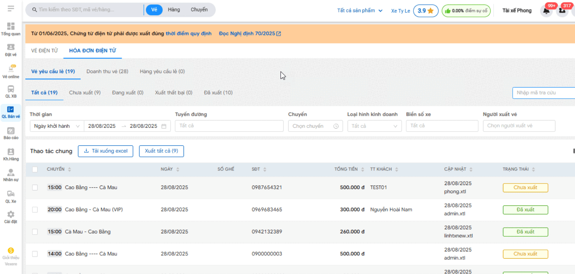 Bước 4: Vào Quản lý bán vé → Hóa đơn/vé điện tử