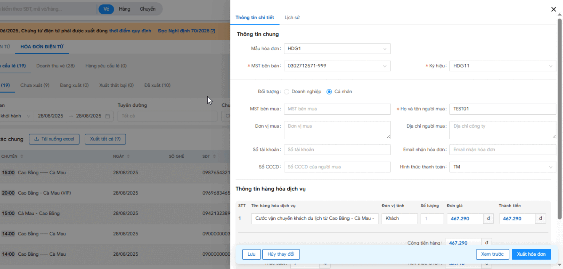 Xem thông tin và in hóa đơn điện tử cho cả chuyến