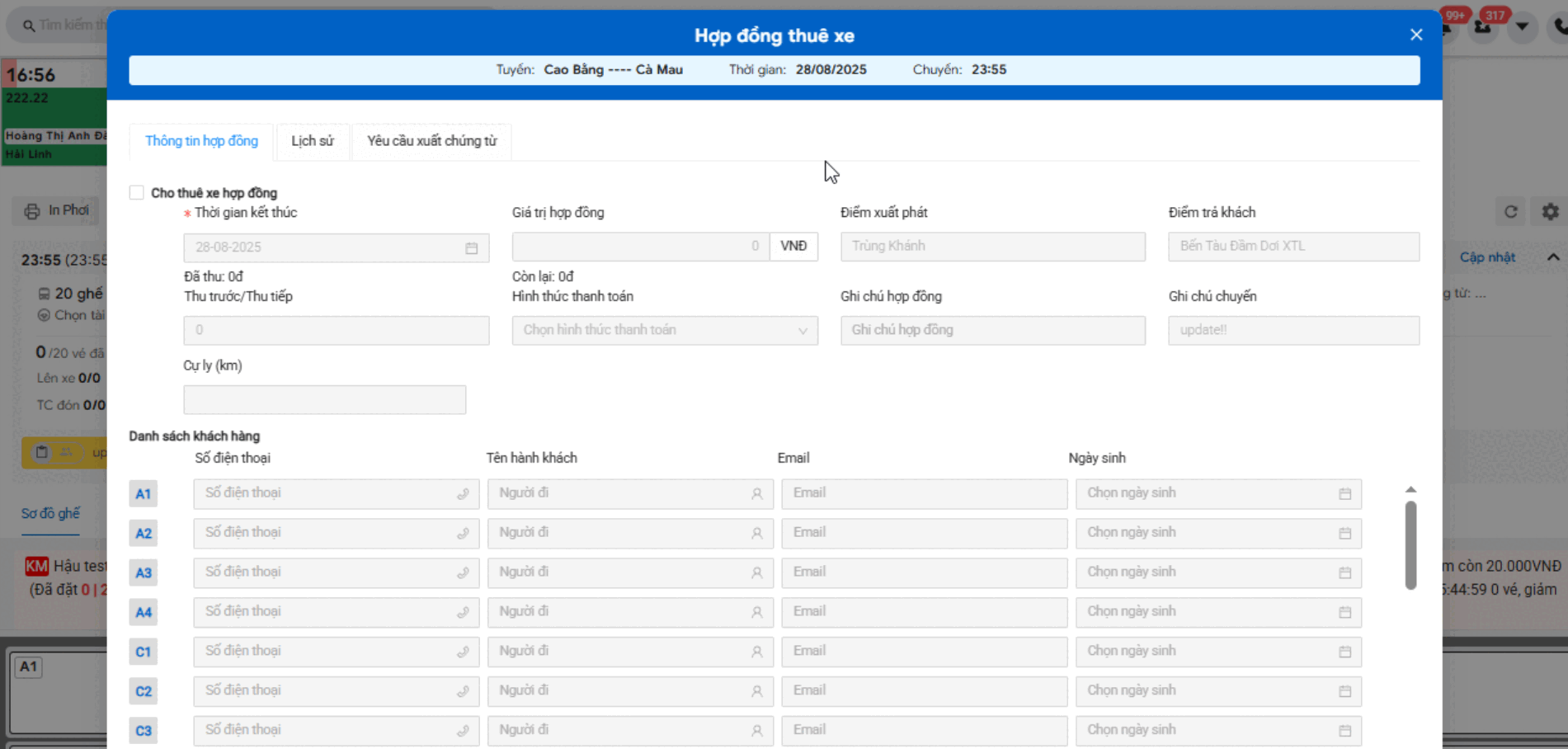Bước 1: Vào màn hình Đặt vé → … → Hợp đồng thuê xe