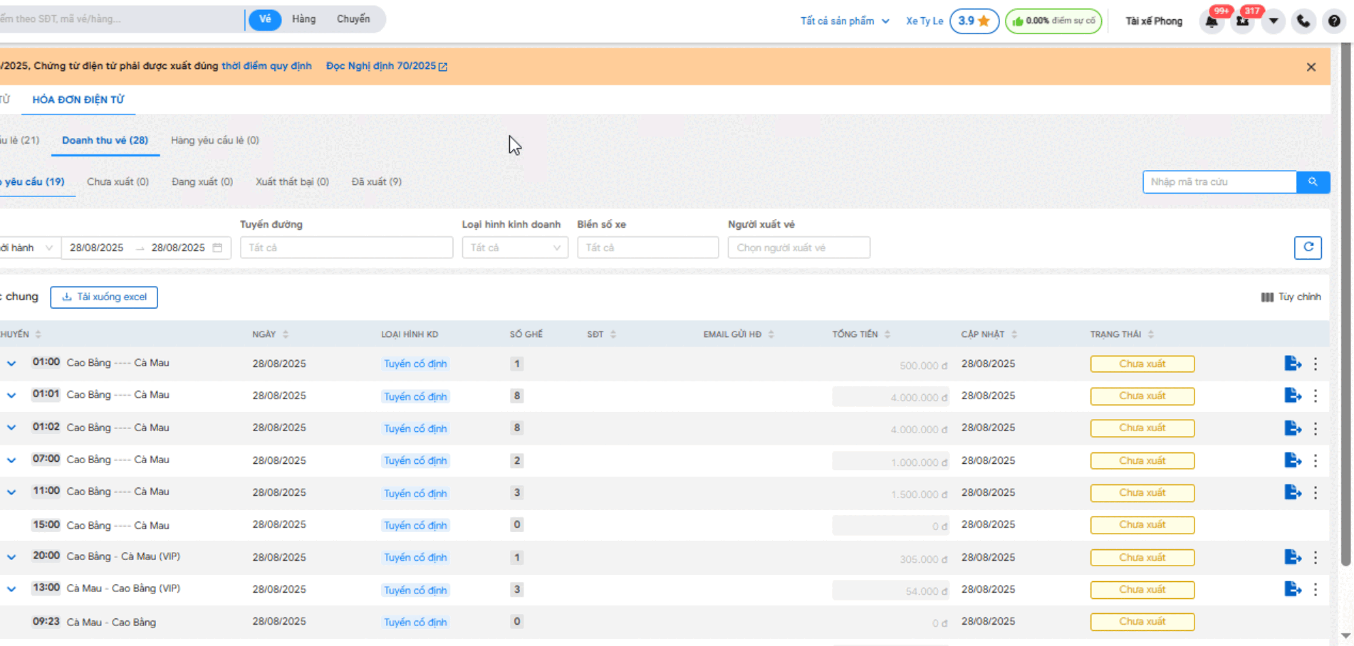 Bước 5: Vào Hóa đơn điện tử → Doanh thu vé → Tìm chuyến muốn xuất hóa đơn điện tử → bấm Xuất hóa đơn
