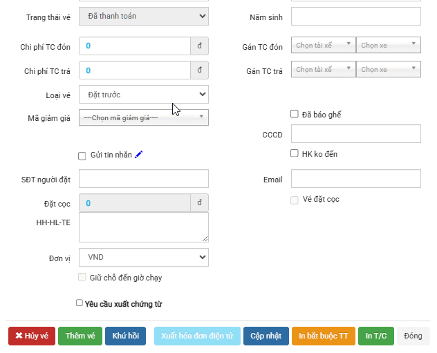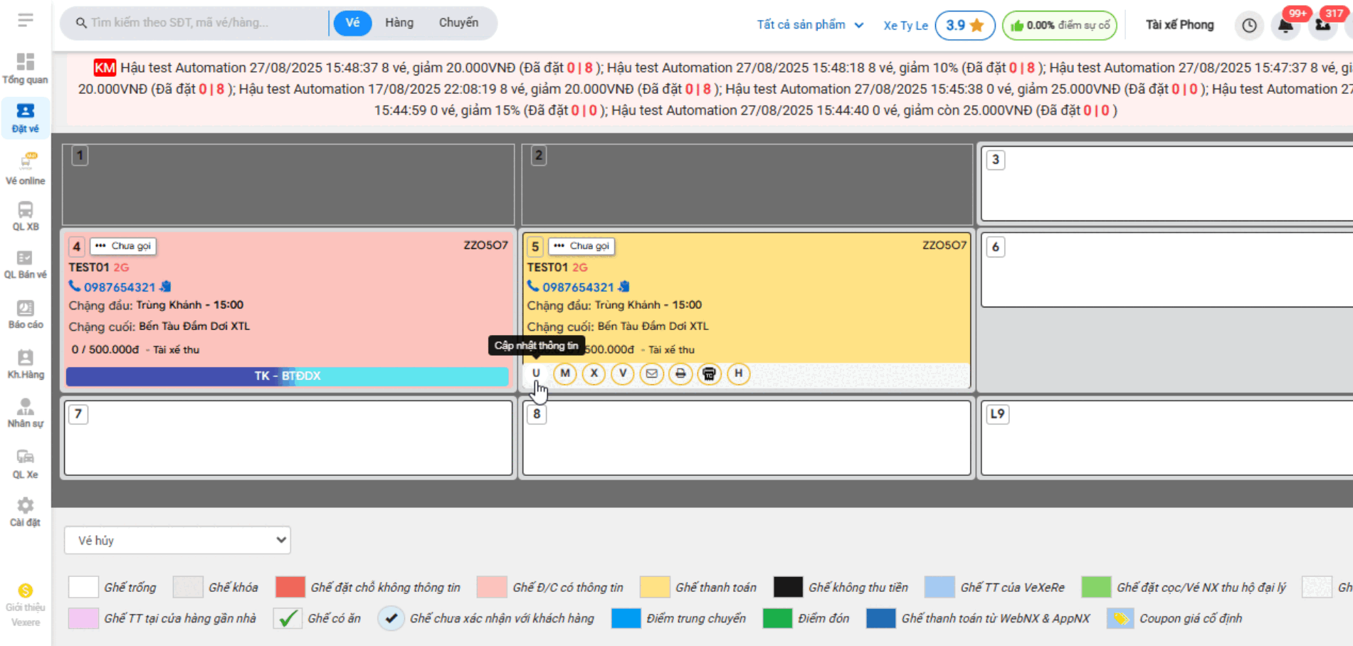 Bước 2: Vào màn hình đặt vé, bấm U để cập nhật thông tin vé