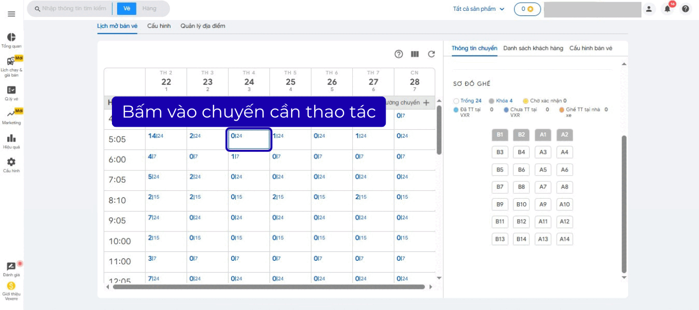 “Lịch mở bán vé” là công cụ để Nhà xe chủ động theo dõi các chuyến xe đã và đang mở bán online trên sàn Vexere. Bài viết này hướng dẫn Nhà xe sử dụng công cụ “Lịch mở bán vé” để khóa/mở ghế online trên sàn Vexere.