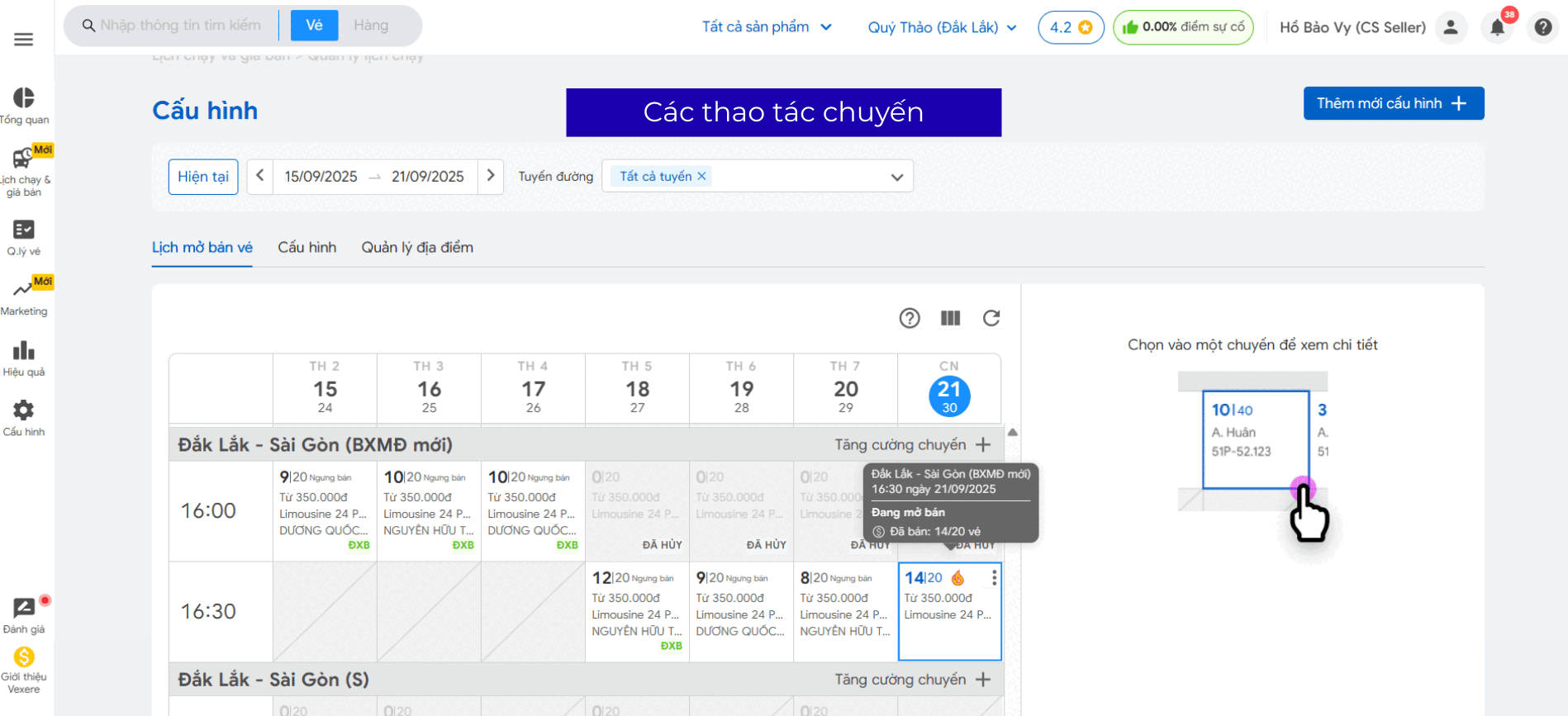 Khi nhấp chuột vào một ô chuyến, màn hình sẽ hiển thị các thông tin và tùy chọn sau: